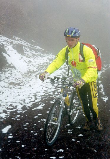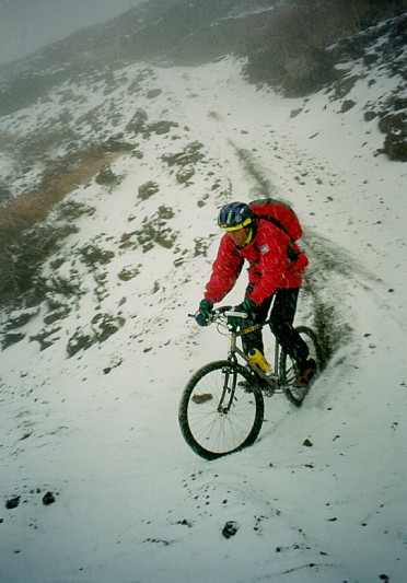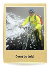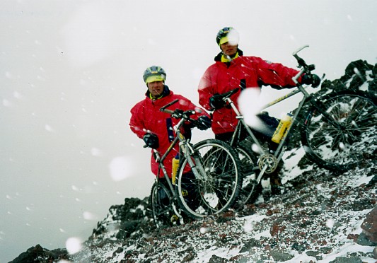 Zabrakło nam więc niewiele, bo zaledwie 470 metrów do wierzchołka. Zarządziłem odwrót. Okazało się, że zejście jest miejscami bardzo trudne. Śnieg zasypał szczeliny i skały. Ale znoszenie roweru na ramieniu nie trwało długo. Wreszcie zaczął się zjazd. Nie był jednak łatwy. Sypki, wulkaniczny żwir znacznie utrudniał manewry.