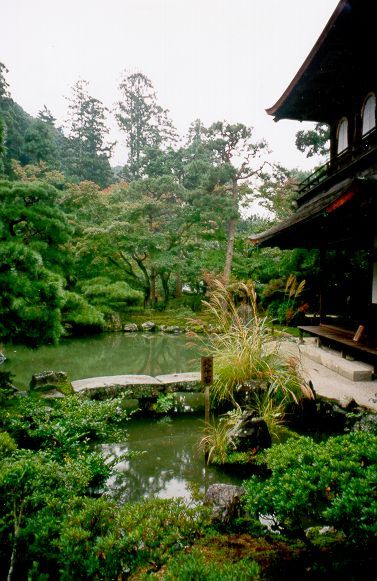 Srebrny pawilon otoczony jest ogrodem - małym arcydziełem wykonanym w materiale natury, którym są woda, drzewa, skały i piasek. Staw niewielki, nieregularnie ukształtowany, wydaje się duży dzięki zręcznemu ugrupowaniu krzewów i kamieni na brzegach. Wędrując krętą ścieżką wzdłuż małych zatok, miniaturowych występów skalnych, z których pochylają się nad wodą gałęzie sosen, lilipucich wysepek połączonych z brzegiem kładkami z płaskich kamieni - odkrywa się stale nowe perspektywy. Każdy z porośniętych mchami kamieni ma nieomal własną indywidualność. Drzewa, krzewy, paprocie o zróżnicowanej gradacji zieleni, z odmiennymi wygięciami gałęzi, rysunkami liści i szpilek, woda oblewająca kępy traw, lśniąca w słońcu, przejrzysta pod nawisami skał, żwir ścieżki - wszystko to stapia się w pejzaż idealny. Prócz prawdziwego stawu znajduje się tu również „jezioro srebrnego piasku". Drobnoziarnisty, jasnoszary pasek usypany jest w wysoką płaską grzędę o nieregularnym kształcie. Zarysowane grabiami na powierzchni fale miały za zadanie odbijać światło księżyca i rozpraszać je po ogrodzie. Obok, usypany również z piasku niewielki kopiec symbolizuje górę Fuji.