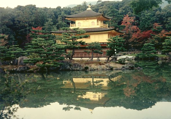 Znajduje się tu jedna z najbardziej znanych budowli w Japonii - Złoty Pawilon. Zdjęcie tej świątyni, odbudowanej po pożarze w 1955 roku (podpalił ją obłąkany mnich), znajduje się w każdym albumie, czy przewodniku o Kraju Kwitnącej Wiśni. Blask szlachetnego kruszcu pokrywającego ściany odbija się od tafli stawu, faluje przy najmniejszym wietrze, łamie się na wysepkach. Najpiękniej jest tu, gdy słońce zbliża się do linii horyzontu. Wówczas złoto nie oślepia, lecz rozświetla otaczający ogród migotliwymi blikami.