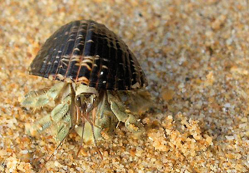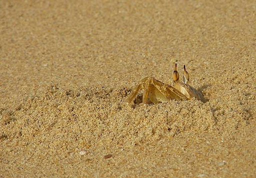Krab ostrożnie sprawdza teren przy swojej norce.