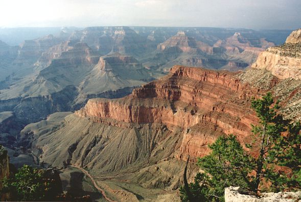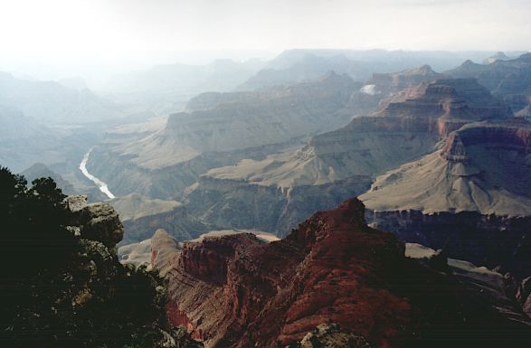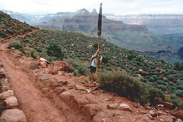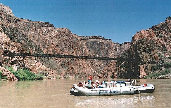 W Biurze Informacji Turystycznej dowiadujemy się, że zjazd rowerami w głąb Kanionu jest niemożliwy, tzn. zabroniony. A to pech. Pozostaje nam tylko zejść w dół na piechotę. Okazuje się, że część szlaków jest tego dnia zamknięta, gdyż wczorajsza burza zniszczyła niektóre odcinki. Schodzimy więc szlakiem o nazwie Kaibab. Co prawda miejscami był on stromy, ale rowerami spokojnie dałoby się zjechać. Fakt, że ruch na szlaku raczej uniemożliwiałby swobodną jazdę. Pozostaje nam tylko obejść się smakiem szalonego zjazdu. Idziemy szybkim tempem, więc wyprzedzamy sporo turystów. Ci, którzy idą w przeciwną stronę nie wyglądają na „świeżych” – są spoceni i zmęczeni. No tak, temperatura nas nie rozpieszcza. Ugotować się można, a na szlaku nie ma żadnego źródła wody, nie wspominając o sklepiku z prowiantem. Dopiero na samym dole, nad rzeką Kolorado jest schronisko i życiodajny płyn. My jednak dobrze się zabezpieczyliśmy. Mamy z sobą po 3 litry wody na głowę i zapas jedzenia. W przewodniku ostrzegają o możliwości „złapania” udaru termicznego. No i wszyscy odradzają żebyśmy nie robili „down & up”, czyli zejścia do rzeki i wejścia z powrotem na krawędź tego samego dnia. Ponoć to za wielki wysiłek, temperatura i w ogóle. Nie wiedzą, że jesteśmy twardzi! W połowie drogi napotkany strażnik parku mówi to samo i nakazuje nam zawrócić lub spać w schronisku na dole. Tłumaczymy, że zejdziemy jeszcze trochę i zaraz wracamy. Dał się przekonać. A my oczywiście zeszliśmy do rzeki. Po wiszącym moście przeszliśmy na przeciwny brzeg Kolorado. Woda w rzece miała kolor kremowo-brązowy. To skutek wczorajszej burzy. Jesteśmy 900 metrów poniżej i 16 km od krawędzi Kanionu. Powietrze stoi w miejscu. Nie, przepraszam – faluje od gorąca. Spora grupa turystów szykuje się do spływu na ogromnych pontonach. Przy okazji dowiedzieliśmy się, że aby skosztować raftingu trzeba zarezerwować sobie miejsce przynajmniej z rocznym wyprzedzeniem!