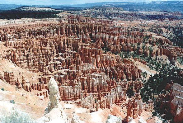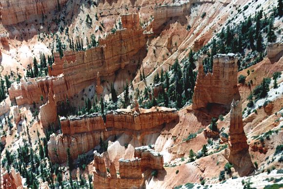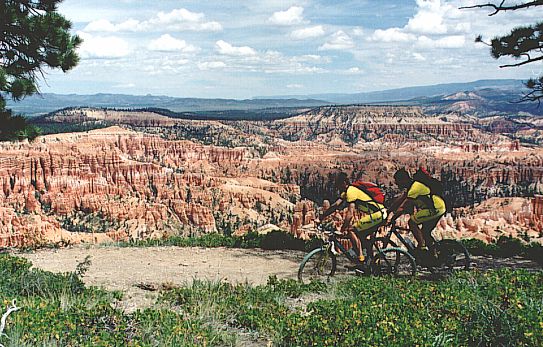 Nieświadomi pięknych widoków, które nas czekały, wsiedliśmy na rowery i ruszyliśmy pod górę w kierunku Kanionu Bryce’a. Gdy w końcu dotarliśmy do pierwszego punktu widokowego naszym oczom ukazał się widok, który powalił nas z nóg: wielokolorowe rzędy kolumn wycięte z miękkiej skały przez słońce, wiatr i deszcz. Niektóre łączą się w zamki z murami obronnymi i basztami. Gdzie indziej zieją otwory płytkich jaskiń. Nad wszystkim czuwają wyrzeźbione przez naturę posągi Indian.