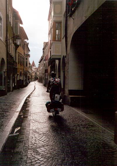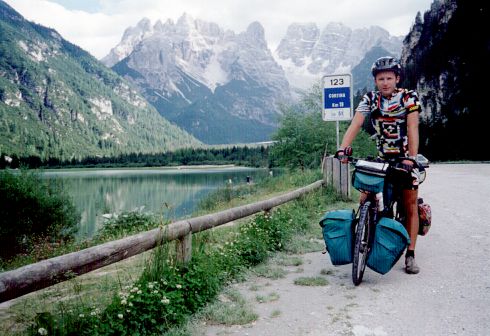 Docieram wreszcie na Grosse Dolomitenstrasse i zdobywam przełęcz Passo di Costalunga (1745 m n.p.m.). w mieście Pozza di Fassa przysiadam na ławce koło jakiegoś domostwa, aby przeczekać burzę z gradobiciem. Jeden z mieszkańców zaprasza mnie na kolację. Spaghetti z dobrym winem smakuje znakomicie.